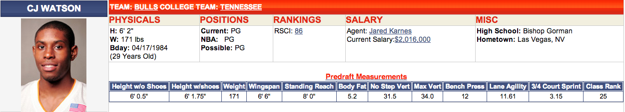 Another piece of information I wanted to have for my basketball analysis are player’s body measurements and skills test results. These measurements are taken at the pre-draft combine where players are put through a series of simple drills such as a non-step vertical leap test. For instance, here are C.J. Watson’s measurements.