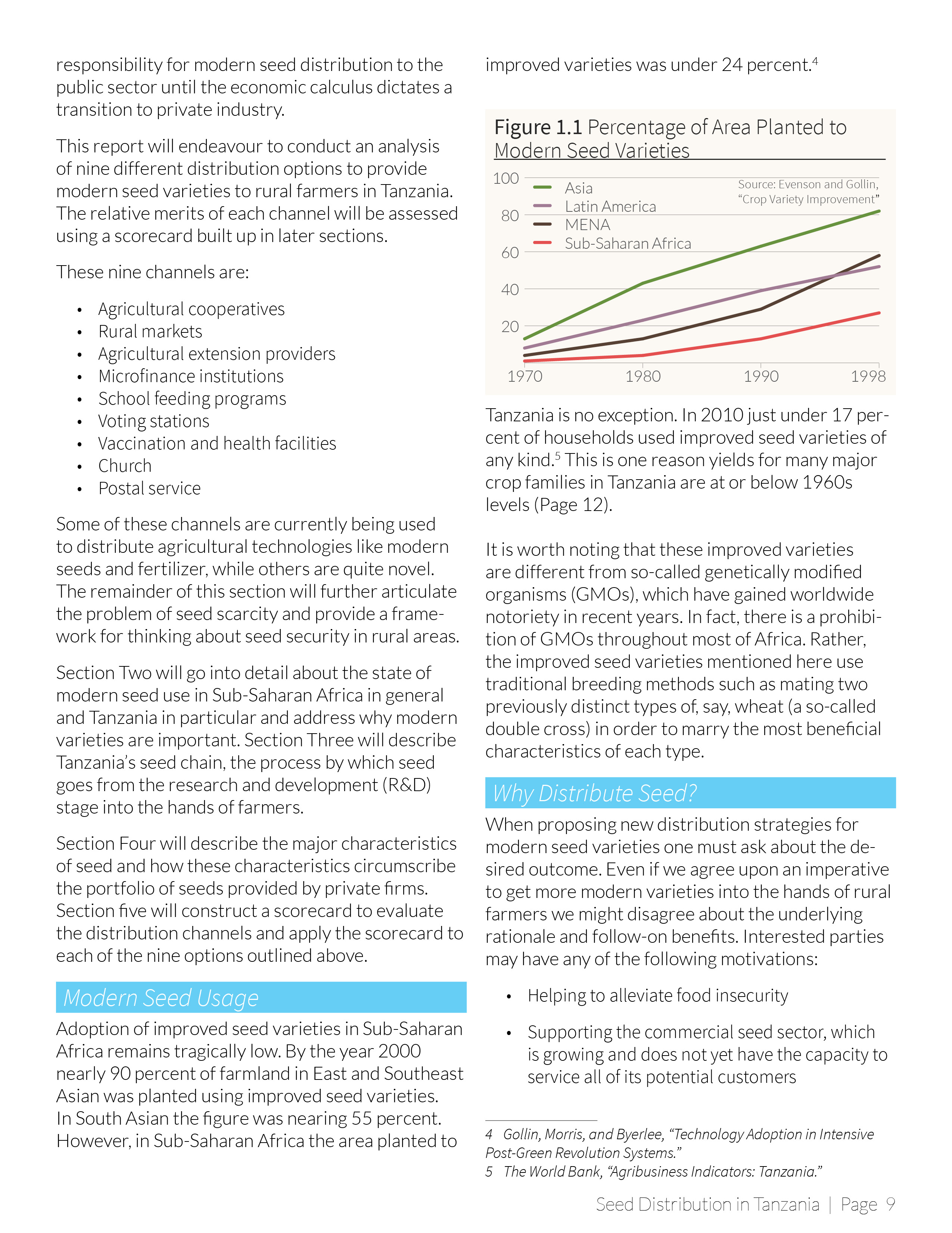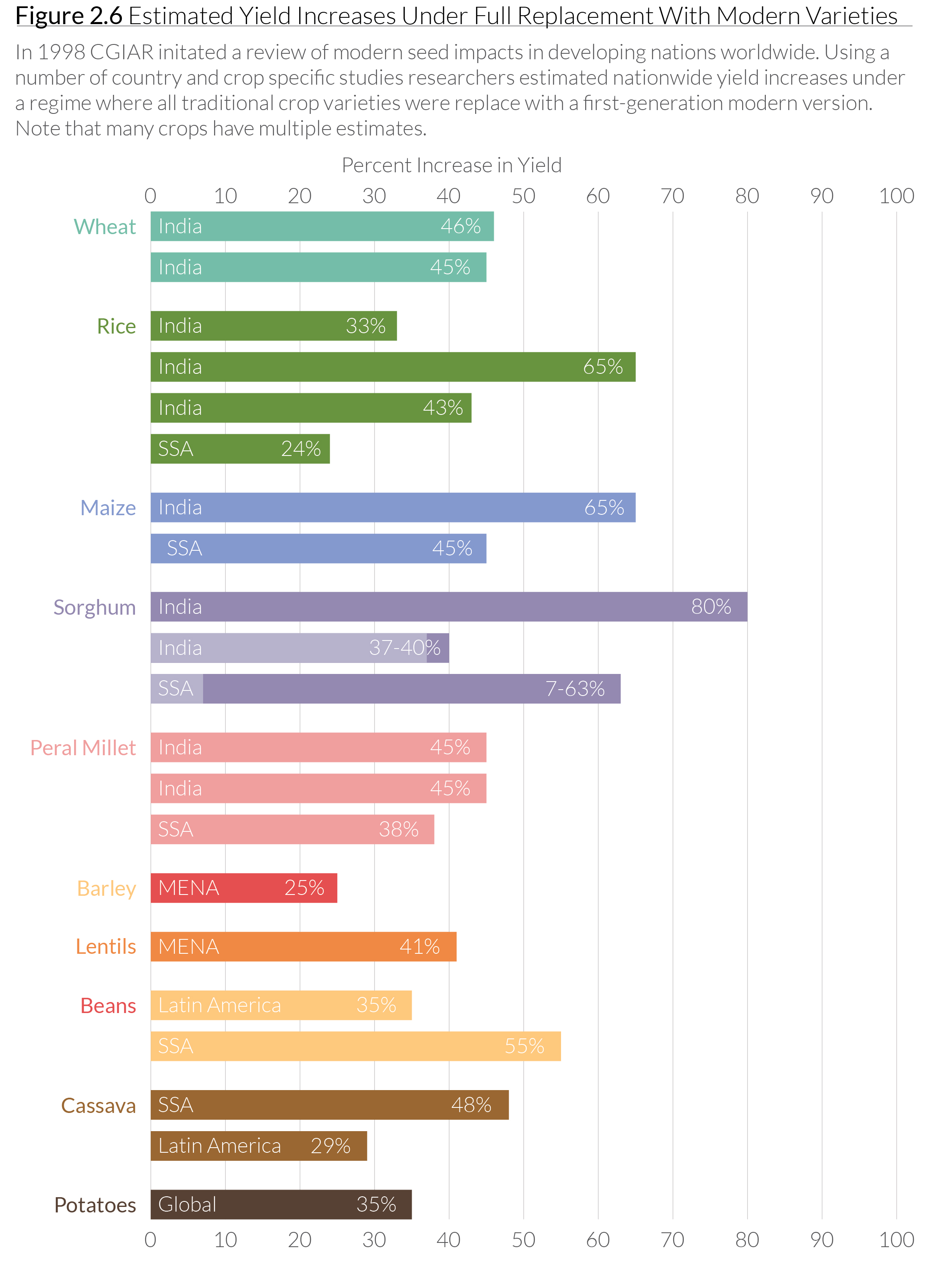This is a chart I made using CGIAR data, which shows the improvement in yield for a variety of crops using so-called “modern seeds” (sometimes called “improved seeds”). These are non-GMO seed varieties cultivated by agronomists using traditional breeding techniques, but in a highly-controlled environment. I created this chart as part of my thesis on agriculture in Tanzania.