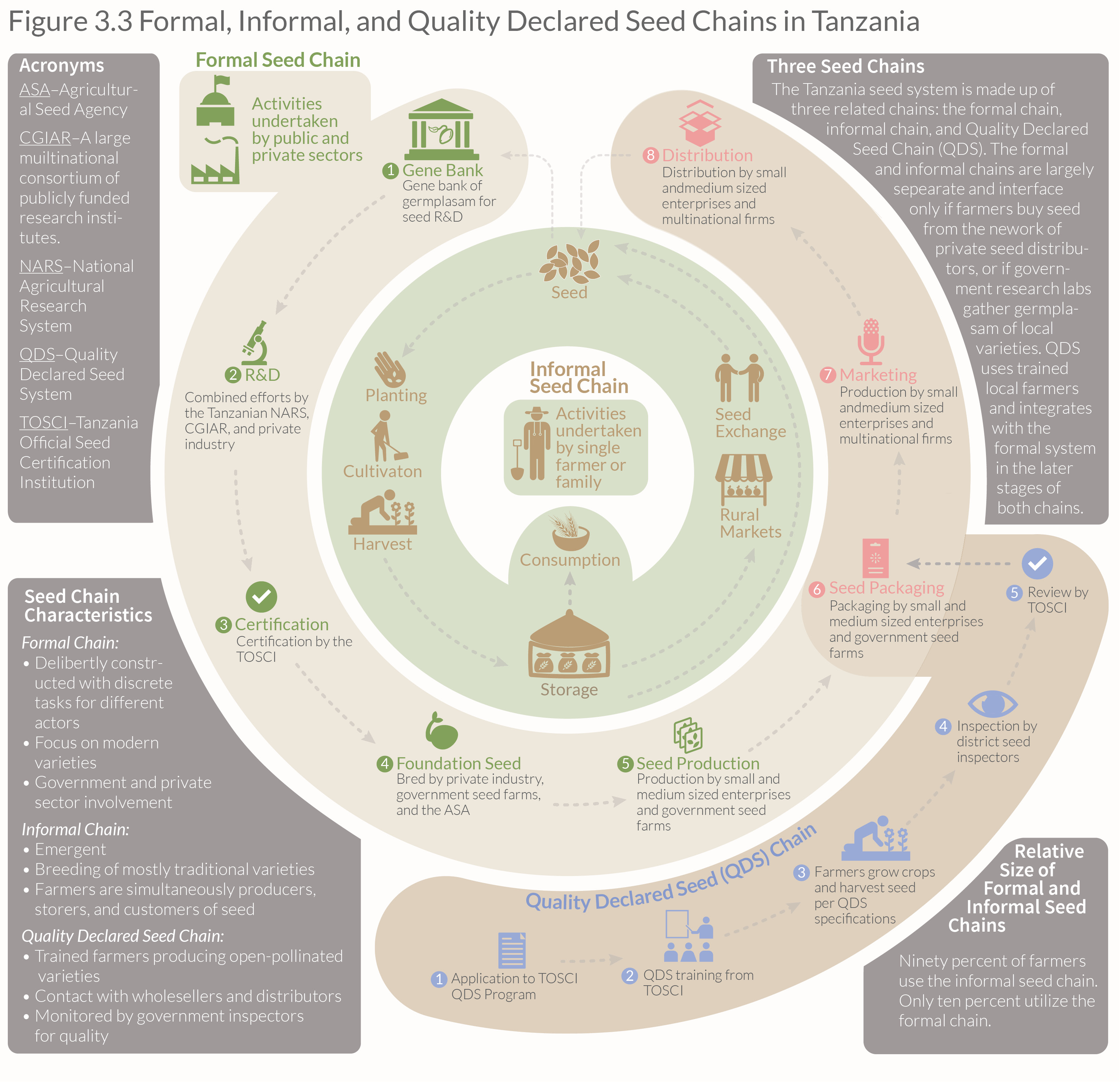This is a chart I made for my thesis on agriculture in Tanzania describing the relationship between Tanzania’s three seed chains. The chart was adapted from several sources and, although it looks simple, it took quite a while to come up with this shape that would depict the relationship between the three different seed system.
