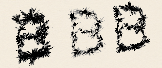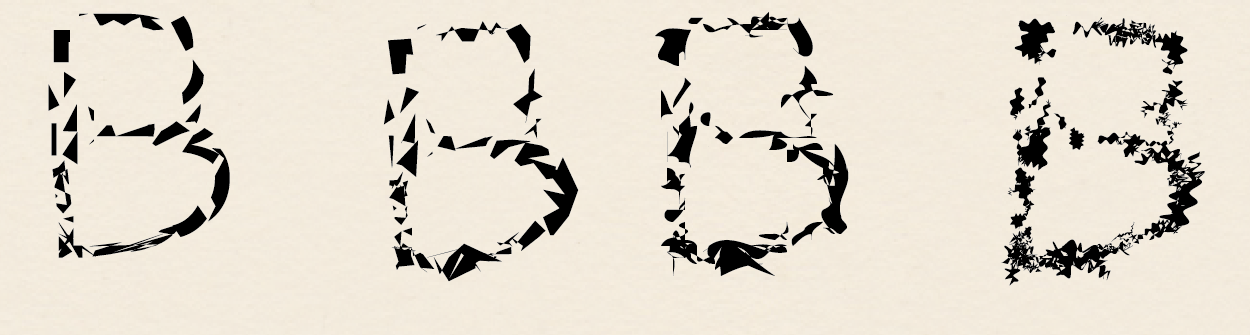 I used a variety of effects to get different looks. Mainly Zig Zag, Roughen, Tweak, Warp, and Twist. Below various versions of these effects are shown for the ‘B.’ I then layered the effects to get the final product.
